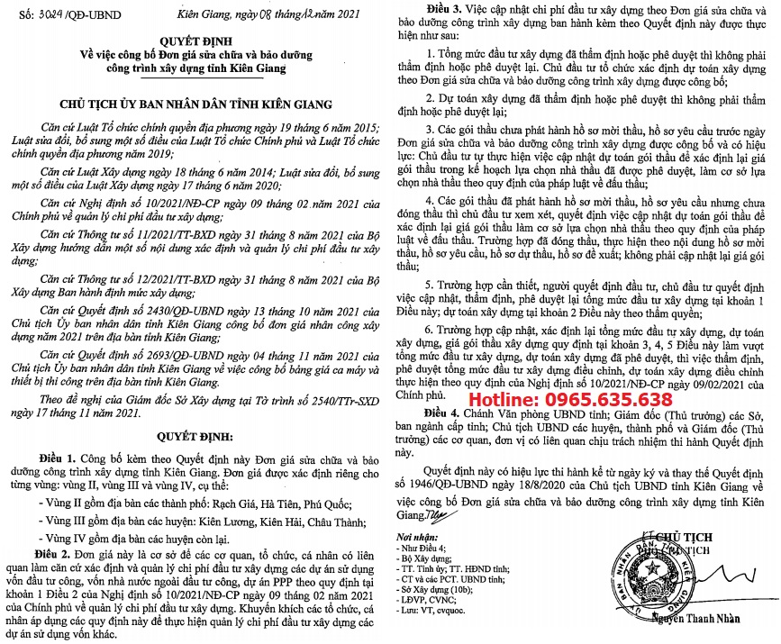 Đơn giá Sửa chữa tỉnh Kiên Giang Quyết định 3024/QĐ-UBND